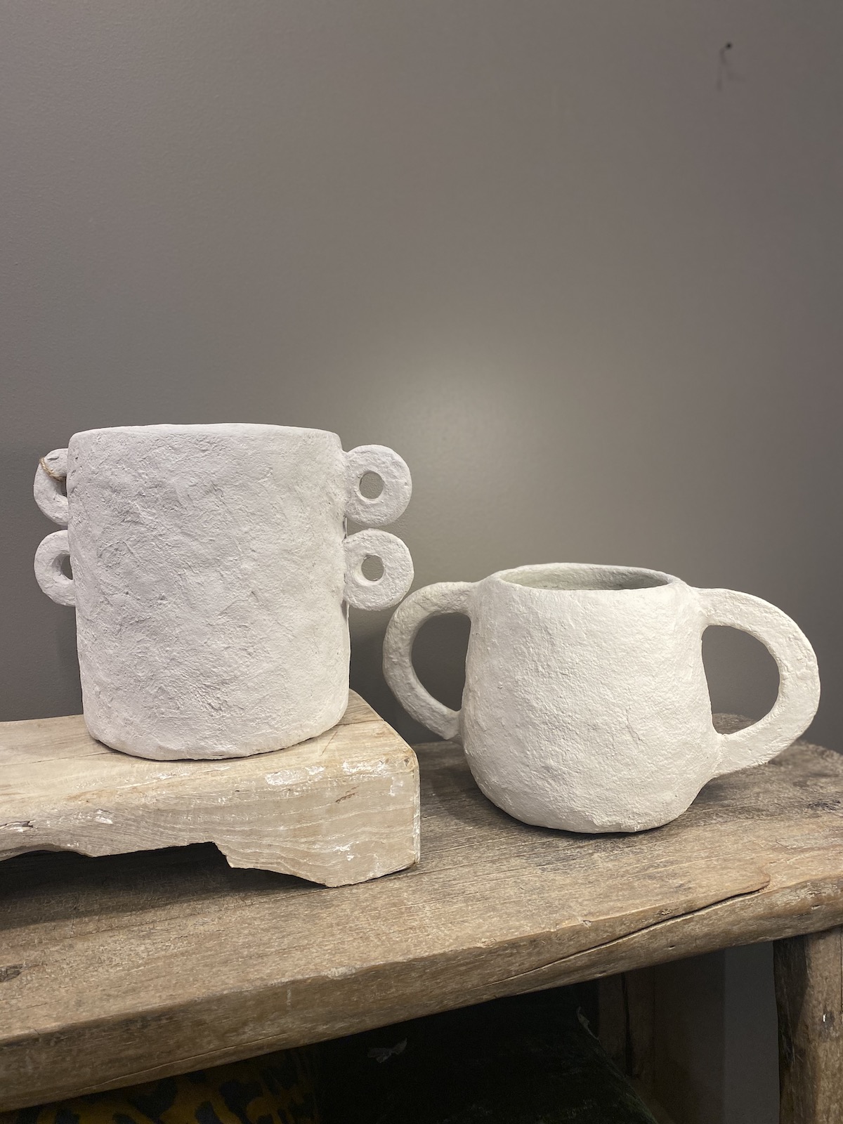 Pot blanc en papier mâché avec 4 petites anses rondes. 20 cm de haut, diamètre 18 cm